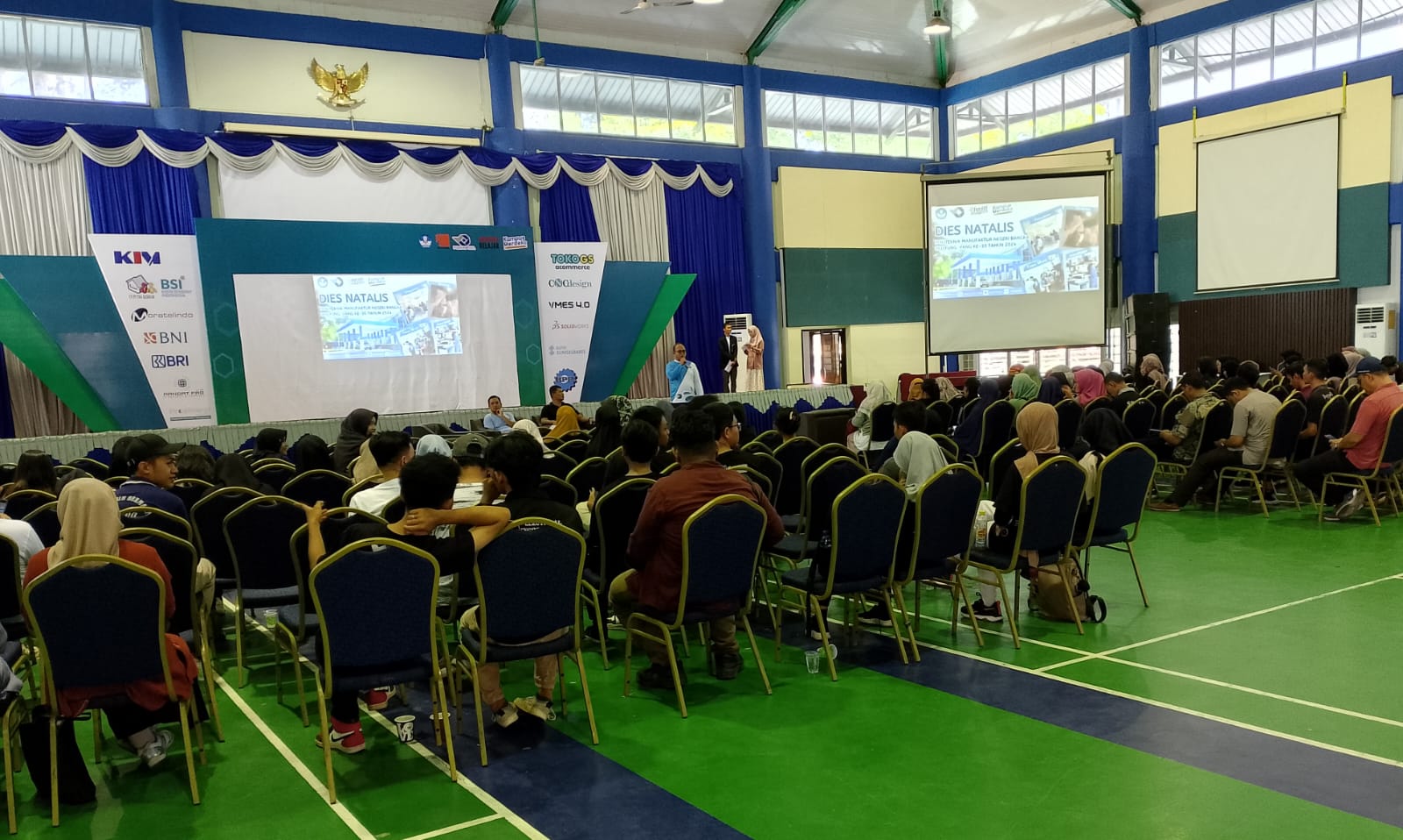 Aula yang dihias dengan tema modern dan sentuhan tradisional menambah suasana khidmat dalam perayaan ini. Musik latar yang lembut mengiringi suasana hangat di antara para hadirin yang tampak larut dalam semangat kebersamaan.
