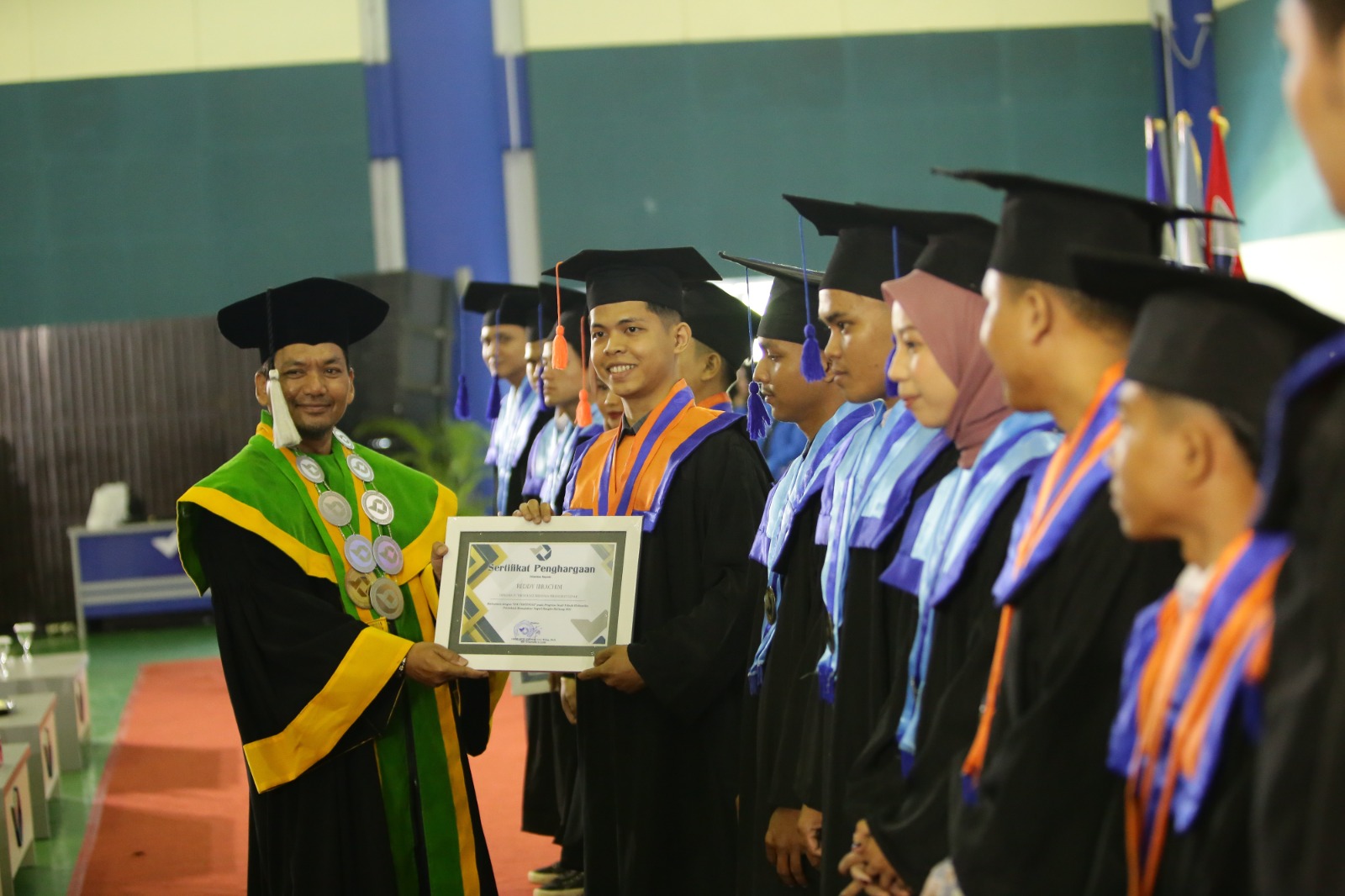 For the Diploma III level, outstanding students with the highest GPAs included Areza Muharramin from Mechanical Design Engineering with a GPA of 3.73, Aldi Yusuf Saputra from Machine Maintenance and Repair Engineering with a GPA of 3.68, and Fany Syafira from Electronic Engineering with a GPA of 3.74.